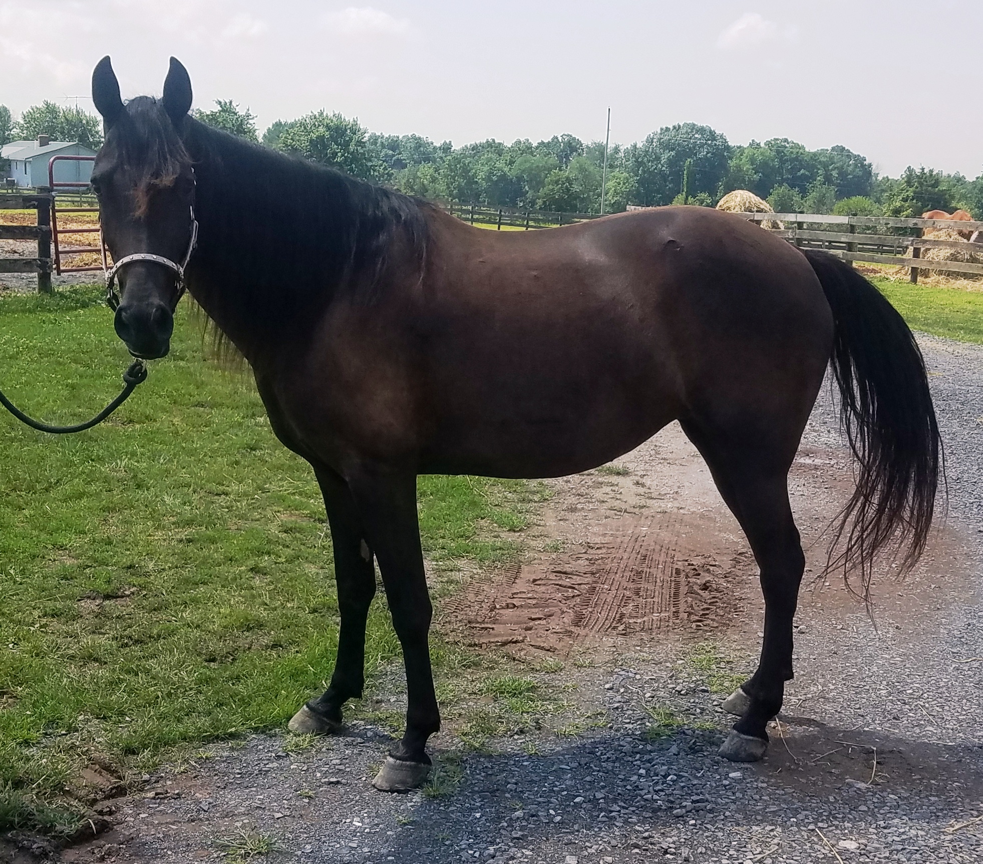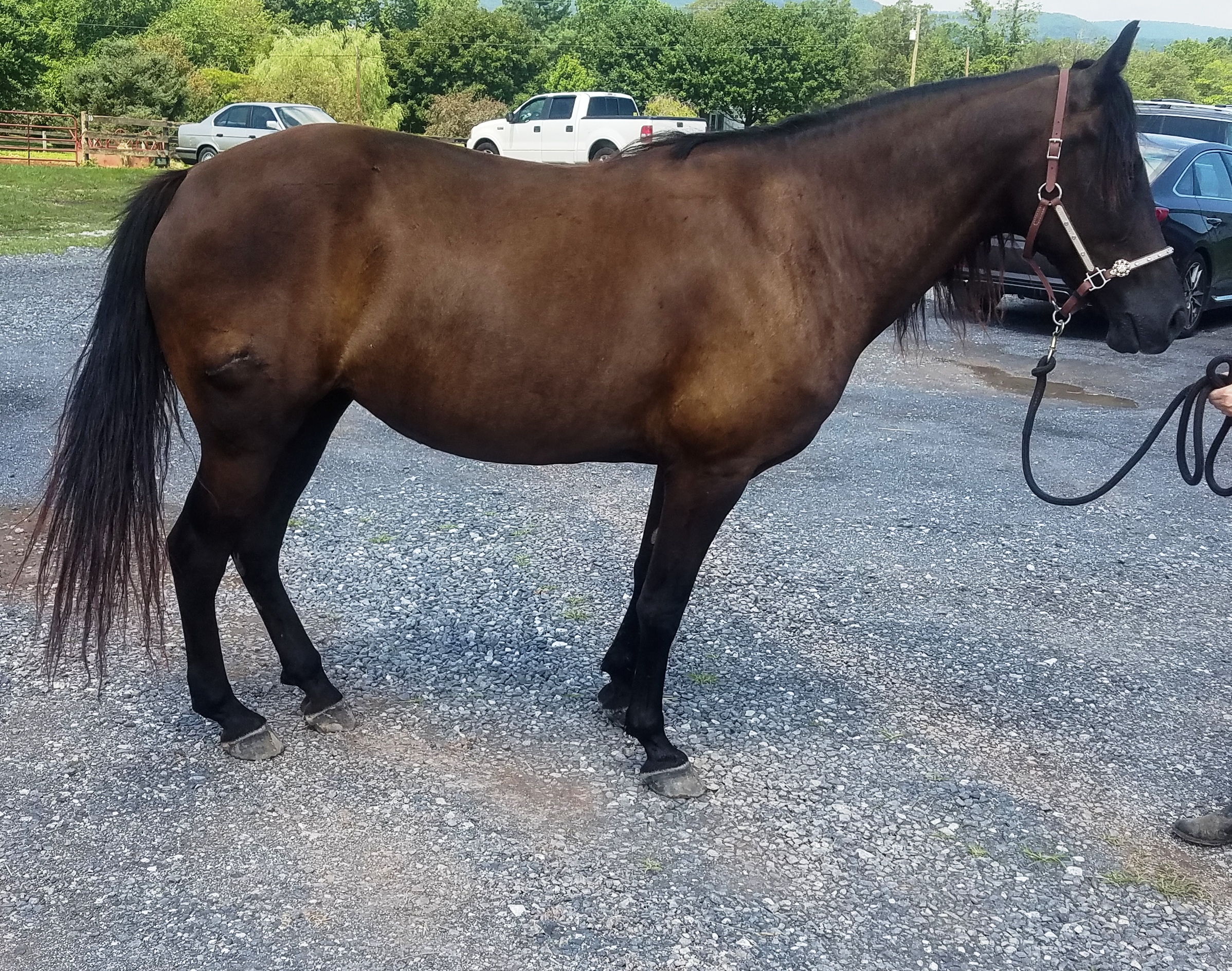 Sarah's perfect person will be someone that likes a leisurely trail ride. She's safe enough for a beginner as long as they have good support of knowledgeable horse people to help with ground work. She was not a fan of the wash stall, so that will take a bit of patient training. She's a little rusty with trailer loading, but will load and travels well. We did not try to use clippers on her so not sure how she'll be with that. Sarah is an easy keeper, she's barefoot and walked soundly even on the gravel driveway. This is a pretty darned incredible mare! We are super excited about her if you can't tell.